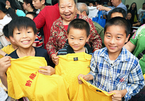 “尹明”助学活动受助学生选到爱心企业捐赠的衣物,脸上洋溢着幸福的笑容(重庆市江北区慈善会供图)